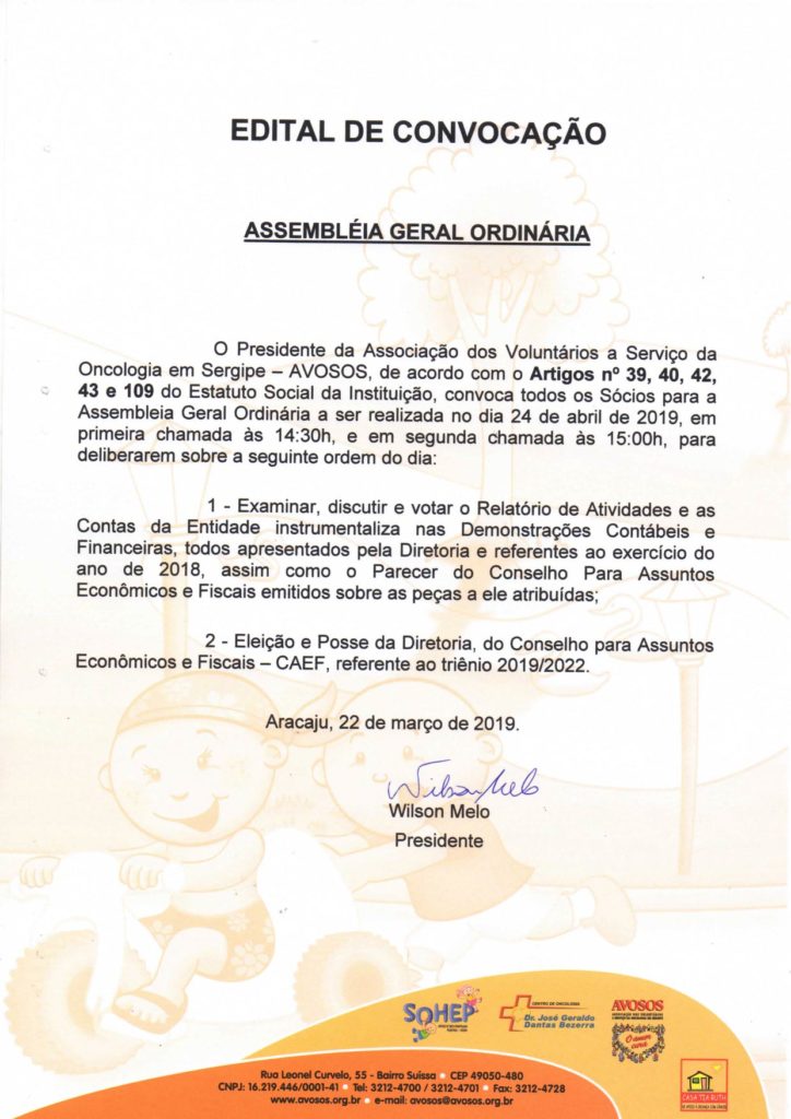 EDITAL DE CONVOCAÇÃO ASSEMBLÉIA GERAL ORDINÁRIA                 O Presidente da Associação dos Voluntários a Serviço da Oncologia em Sergipe – AVOSOS, de acordo com o Artigos nº 39, 40, 42, 43 e 109 do Estatuto Social da Instituição, convoca todos os Sócios para a Assembleia Geral Ordinária a ser realizada no dia 24 de abril […]