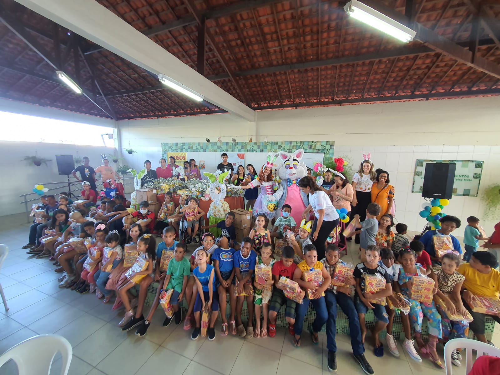 As crianças e adolescentes participaram de uma programação que contou com a participação do Coelhinho da Páscoa. Além das caixas, os assistidos receberam ovos doados pela Cacau Show.