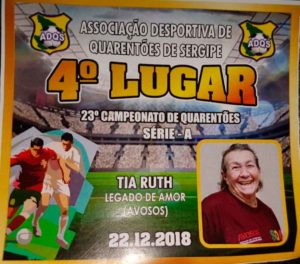 No último mês de dezembro foi a vez da Associação Desportiva de Quarentões de Sergipe render homenagens a Tia Ruth durante a decisão do 23º Campeonato de Futebol de Quarentões de Sergipe – Série A. O evento aconteceu no Campo do Confiança (Rabino Ribeiro), bairro Industrial.
