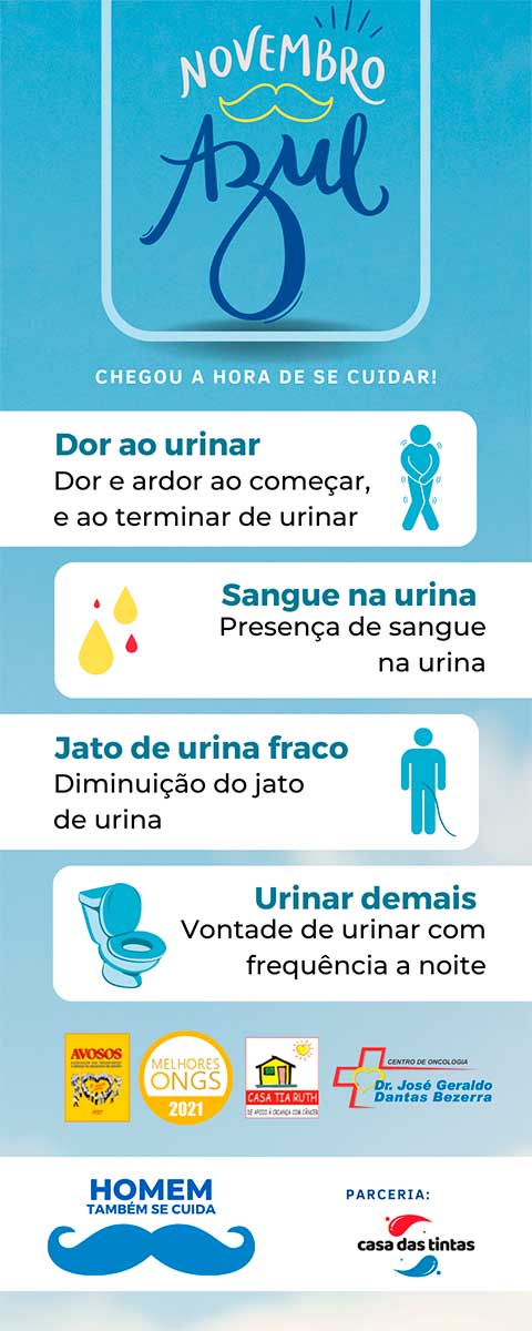 “Homem também se cuida!”. Esta é a campanha Novembro Azul da Associação dos Voluntários a Serviço da Oncologia em Sergipe que, a exemplo de anos anteriores, destaca um mês aos cuidados da saúde do homem, por meio de informações sobre prevenção e diagnóstico precoce do câncer de próstata. Na edição deste ano a Casa das Tintas somou forças com a AVOSOS e pintou a frase no muro: “A cor serve para lembrar que esta causa é de todos”.
