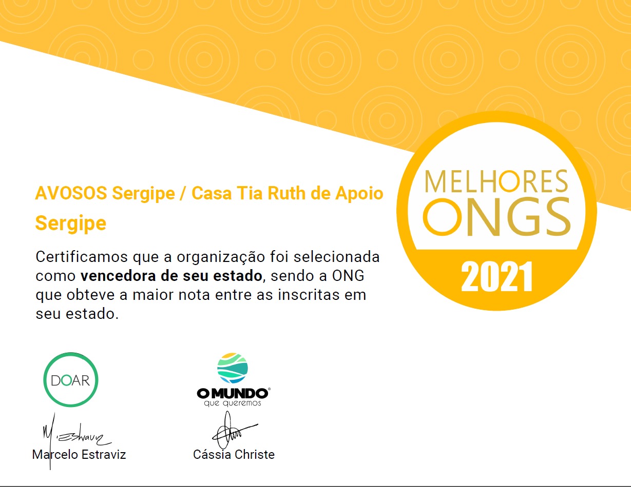 A Associação dos Voluntários a Serviço da Oncologia em Sergipe/Casa Tia Ruth de Apoio à Criança e ao Adolescente com Câncer (AVOSOS) acaba de receber o Certificado Melhores ONGs do Brasil na categoria “Vencedora de seu Estado”, por ter obtido a maior nota entre as inscritas em Sergipe. A premiação é organizada pelo Instituto Doar e pelo O Mundo Que Queremos.