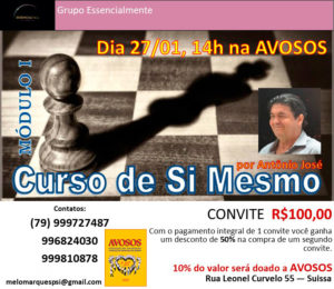 No próximo sábado (27), no auditório da Associação dos Voluntários a Serviço da Oncologia em Sergipe (Avosos), o Grupo Essencialmente realiza o Módulo I do “Curso de Si Mesmo”, com Antônio José Melo Marques. Psicólogo clínico há 25 anos é também escritor, palestrante e professor.