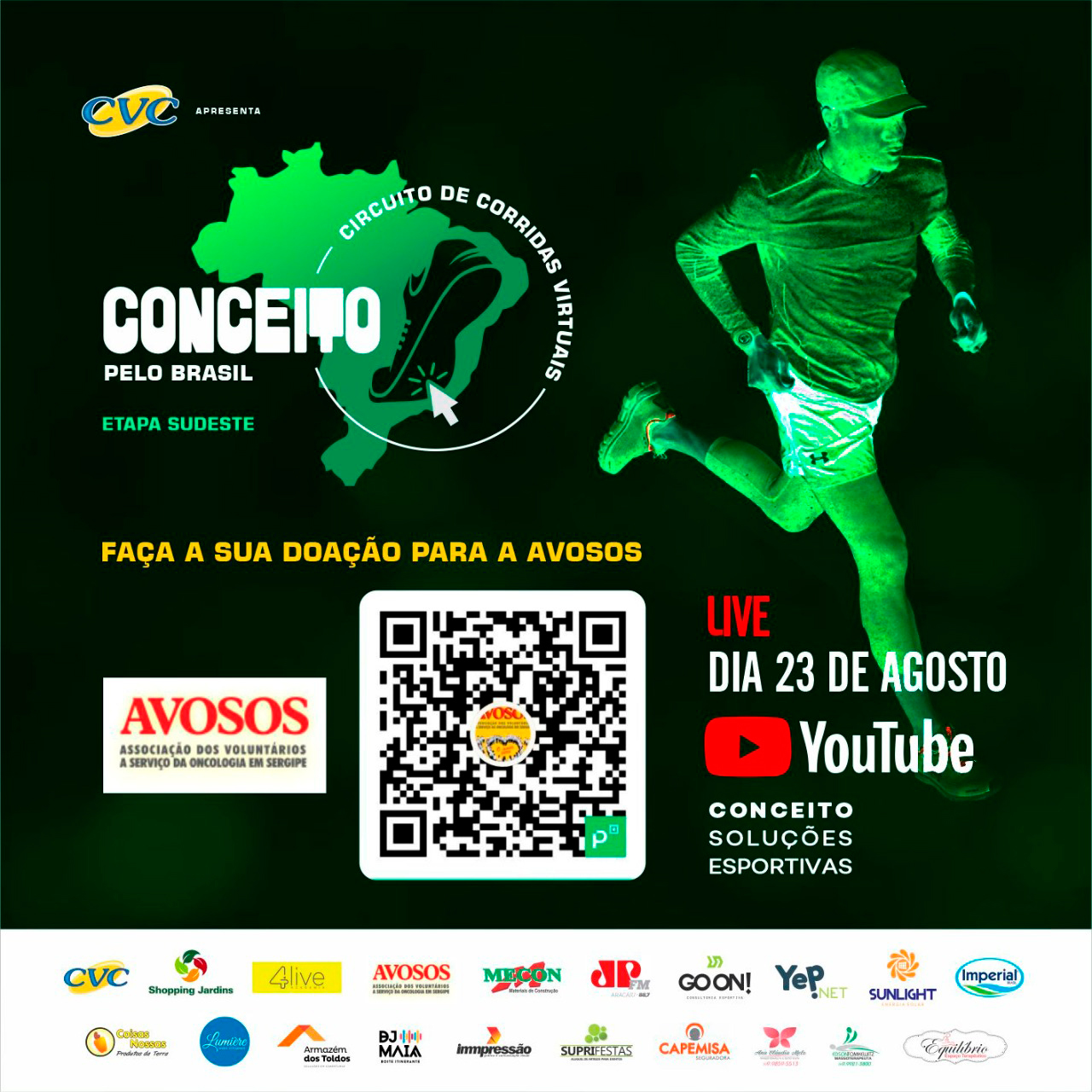 A Associação dos Voluntários a Serviço da Oncologia em Sergipe (Avosos) será beneficiada pelo Circuito de Corridas Virtuais – Etapa Sudeste, realizado pela empresa Conceito Soluções Esportivas. “Contamos com a solidariedade de vocês. Cada doação gerará um número para um sorteio de brindes de parceiros. Anunciaremos os brindes na Live do dia da corrida, 23/08, a partir das 7h30”, informa a Comissão Organizadora do Circuito.