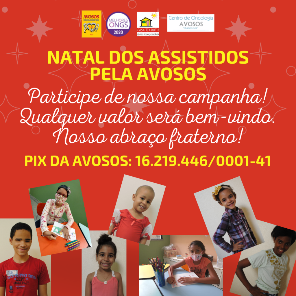 Participe da campanha natalina da AVOSOS! Qualquer valor será bem-vindo para fazer um Natal mais feliz para os nossos assistidos e acompanhantes. PIX 16.219.446/0001-41 Banco do Brasil AG:1224-6 C/C: 4588-8 Banese AG:029 C/C:100489-8 TIPO:03 Caixa Econômica Federal AG:2382 C/C:175-7 TIPO:032 d Nosso abraço fraterno! #AVOSOS #OAmorCura