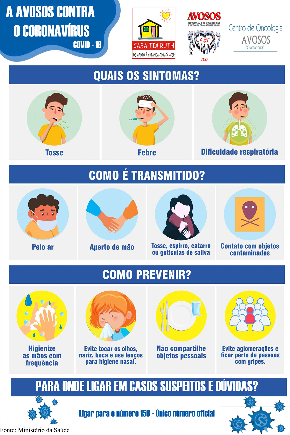 Assim, ficam suspensas: visitas rotineiras à sede da Associação dos Voluntários a Serviço de Oncologia em Sergipe; Curso para novos voluntários; atendimentos que não sejam caracterizados pelo médico como urgentes por parte da Equipe Multidisciplinar; atividades voluntárias no Hospital de Urgência de Sergipe (HUSE) e na Casa Tia Ruth de Apoio. “Teremos uma equipe de plantão, sobreaviso, para entrega de cestas básicas e remédios em dias determinados pelo Setor de Serviço Social da Avosos. Serão permitidas hospedagens na Casa Tia Ruth de Apoio de pacientes em tratamento que sejam caracterizados pelo médico como urgentes. Disponibilizamos o telefone/whatsapp (79) 99145-1333 para quais dúvidas e solicitações dos acompanhantes de nossos assistidos”, destaca o voluntário.