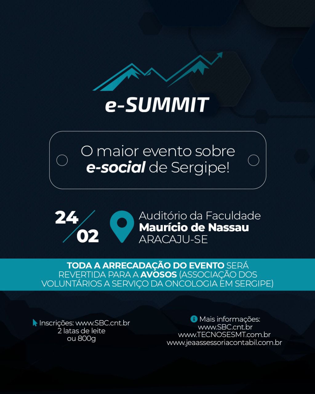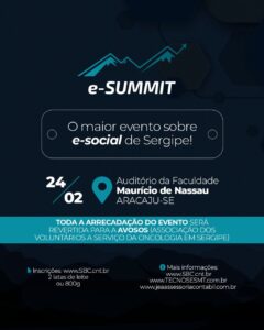 Com caráter solidário, a Sociedade Brasileira de Contabilidade (SBC) realizará o e-SUMMIT no e-Social em SST e as Relações do Trabalho versos COVID-19. Será no dia 24 deste mês, no auditório da Faculdade Mauricio de Nassau em Aracaju/SE, partir das 8 horas.