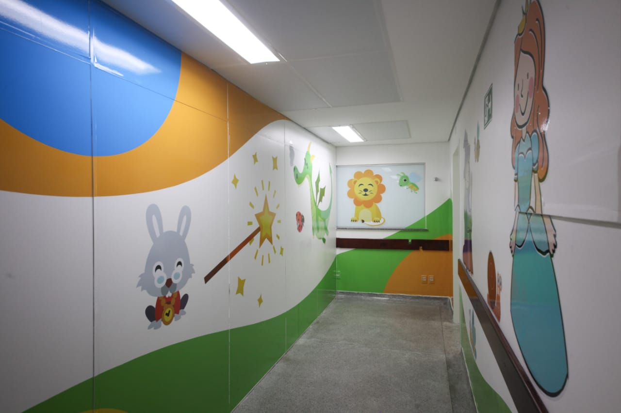 O novo espaço, humanizado e exclusivo para crianças e adolescentes com câncer, tem ilustrações de Rogério Torres e execução da Sinaliza Comunicação Visual Criativa.