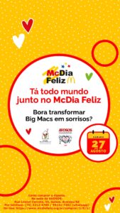 O McDia Feliz é o principal evento beneficente do McDonald’s e, atualmente, é uma das maiores mobilizações em prol de crianças e adolescentes no Brasil. A campanha é realizada no país desde 1988, gerando recursos para as instituições apoiadas pelo Instituto Ronald McDonald, que atuam para proporcionar mais saúde e qualidade de vida a crianças e adolescentes com câncer. Em 2018, o projeto ampliou seu impacto para beneficiar outra causa de grande importância para o país, a Educação, contribuindo para as ações do Instituto Ayrton Senna. Desde sua primeira edição, mais de R$ 360 milhões já foram arrecadados pelo McDia Feliz.