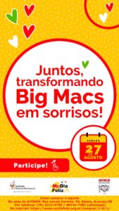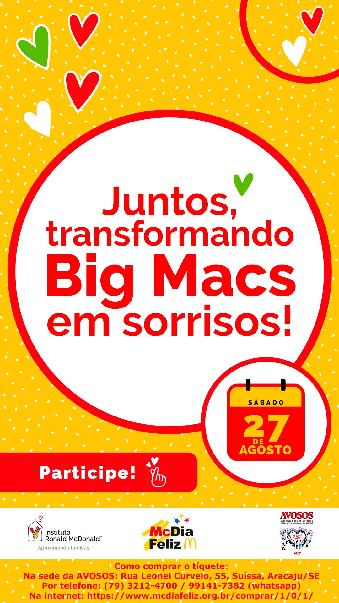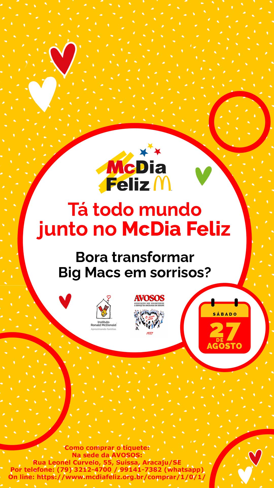 A Associação dos Voluntários a Serviço da Oncologia em Sergipe (AVOSOS) acaba de iniciar a venda antecipada dos tíquetes da 34ª edição do McDia Feliz, uma das maiores campanhas de mobilização em prol da saúde e educação de crianças e jovens do Brasil. Em 2022 a ação vai acontecer no dia 27 de agosto, sábado, com a venda de tíquetes antecipados do sanduiche Big Mac já disponíveis pelo e-commerce https://www.mcdiafeliz.org.br/comprar/1/0/1/ no valor de R$ 18,00 ou para venda física com os voluntários das instituições.