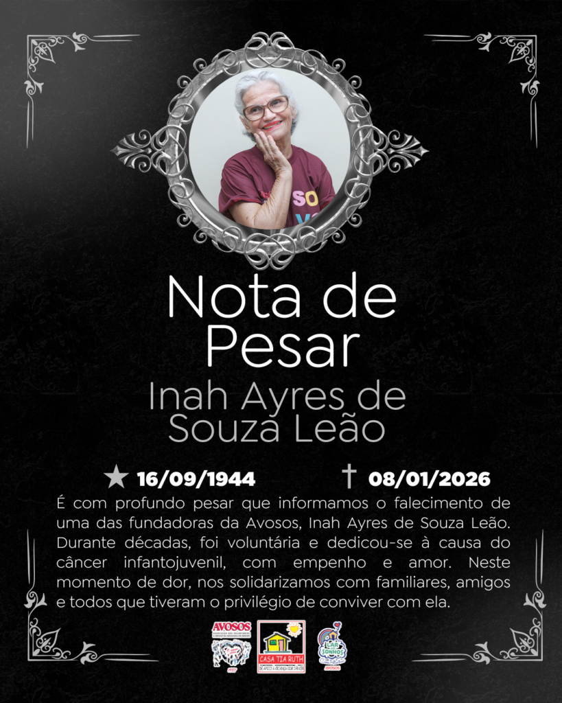 Uma das fundadoras da Casa Tia Ruth de Apoio à Criança com Câncer/Avosos, Inah Ayres Souza Leão, faleceu nesta quinta-feira, 8 de janeiro. Durante décadas, dedicou-se à causa do câncer infantojuvenil, com empenho, amor e dedicação.