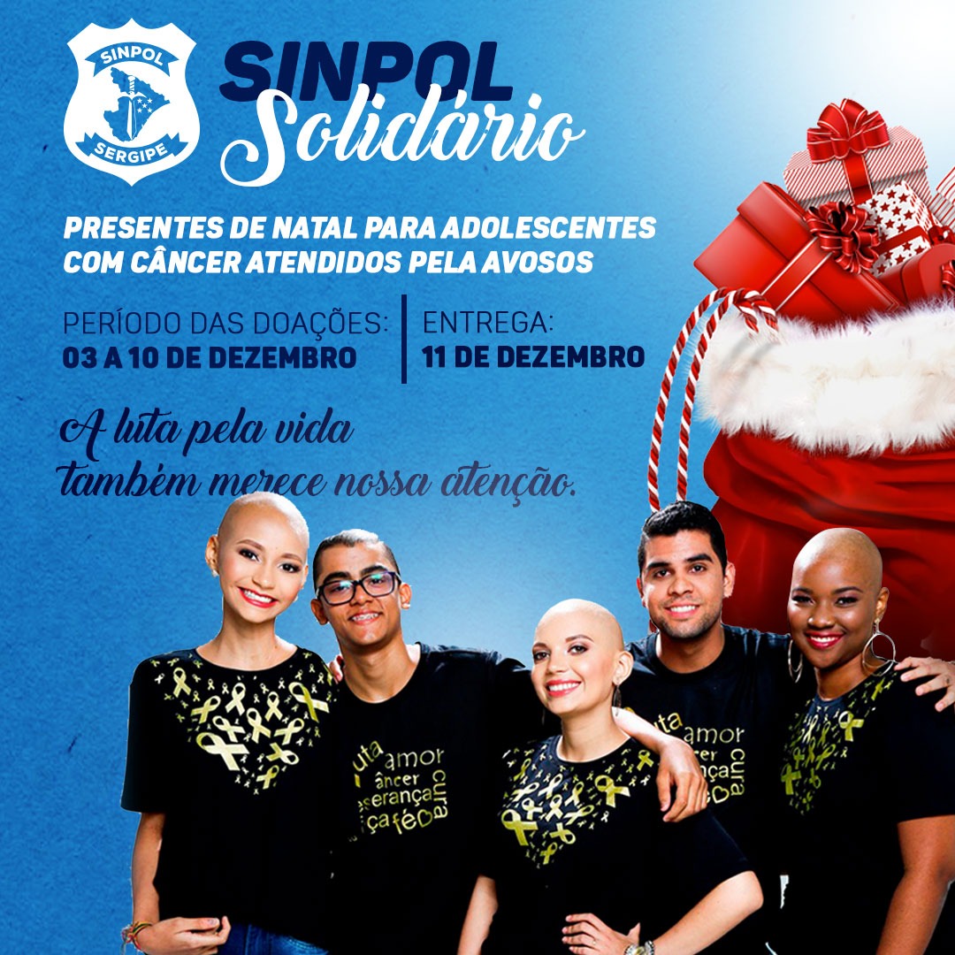 Arrecadar presentes para 82 adolescentes atendidos pela Associação dos Voluntários a Serviço da Oncologia em Sergipe. Essa é a meta do Sindicato dos Policiais Civis do Estado de Sergipe (Sinpol/SE) até a próxima quarta-feira, 11, quando os jovens participarão da festa natalina da Avosos e receberão todos os presentes doados durante o evento. Qualquer pessoa pode doar presente para a campanha Sinpol Solidário que é voltada para 42 garotas e 40 garotos.
